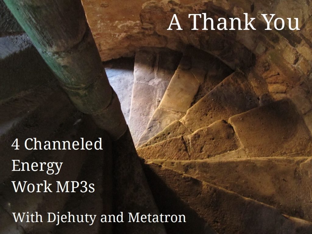 When I call these “energy-work mp3s”, it means that through my voice on the recordings you can draw Hermes (a.k.a. Ascended Master Djehuty, St. Germain, Thoth, and Merlin) and Archangel Metatron to come to you to do energy work on you. Letting the vibration in my voice into your field will alter your energy and shift your consciousness as you are calibrated to the clearing and strengthening energies I channel on the recordings. As you make the silent empowering decisions they ask you to do along the way, you co-opt their energies and stuck things in your field begin to move up and out.