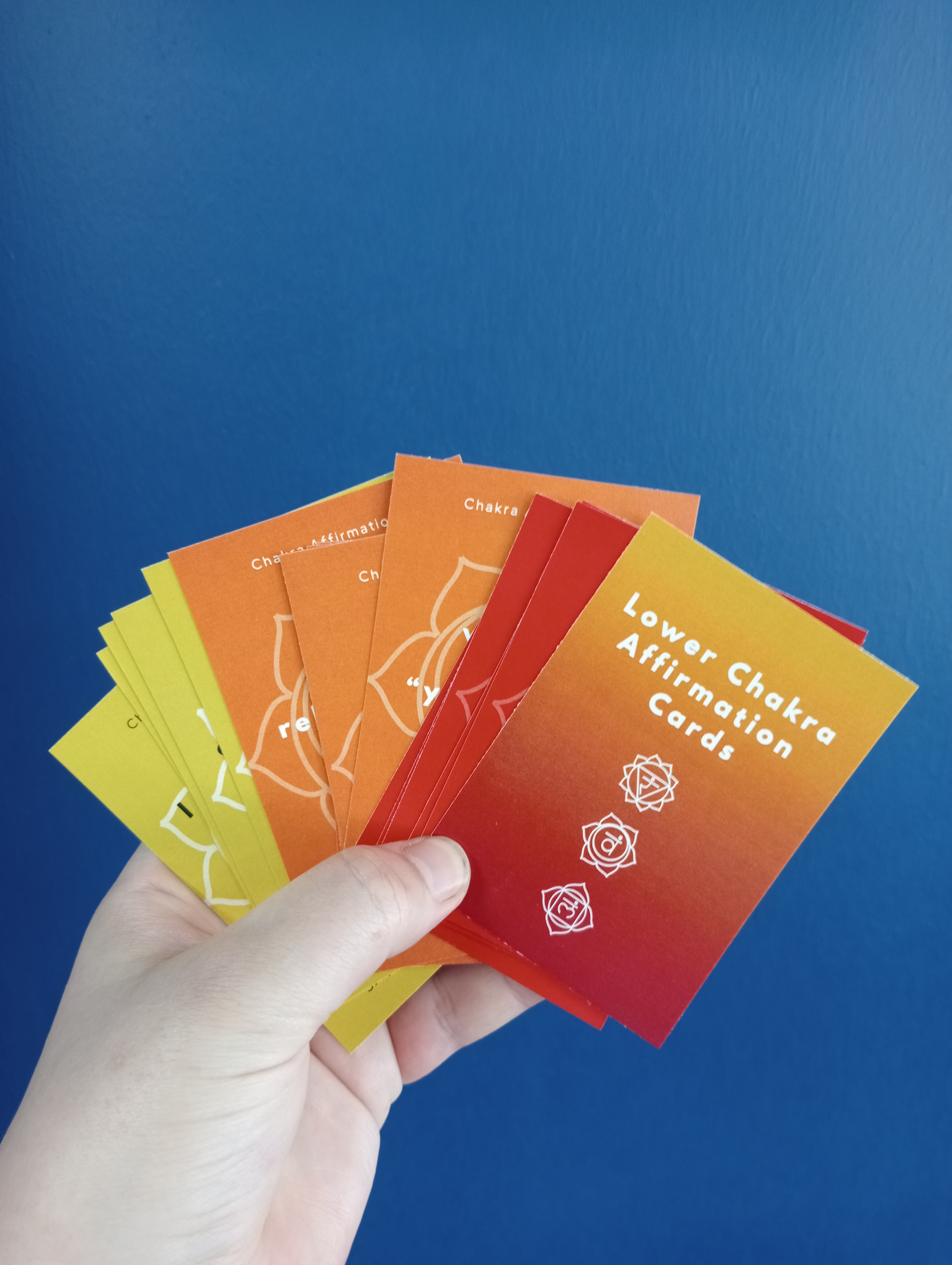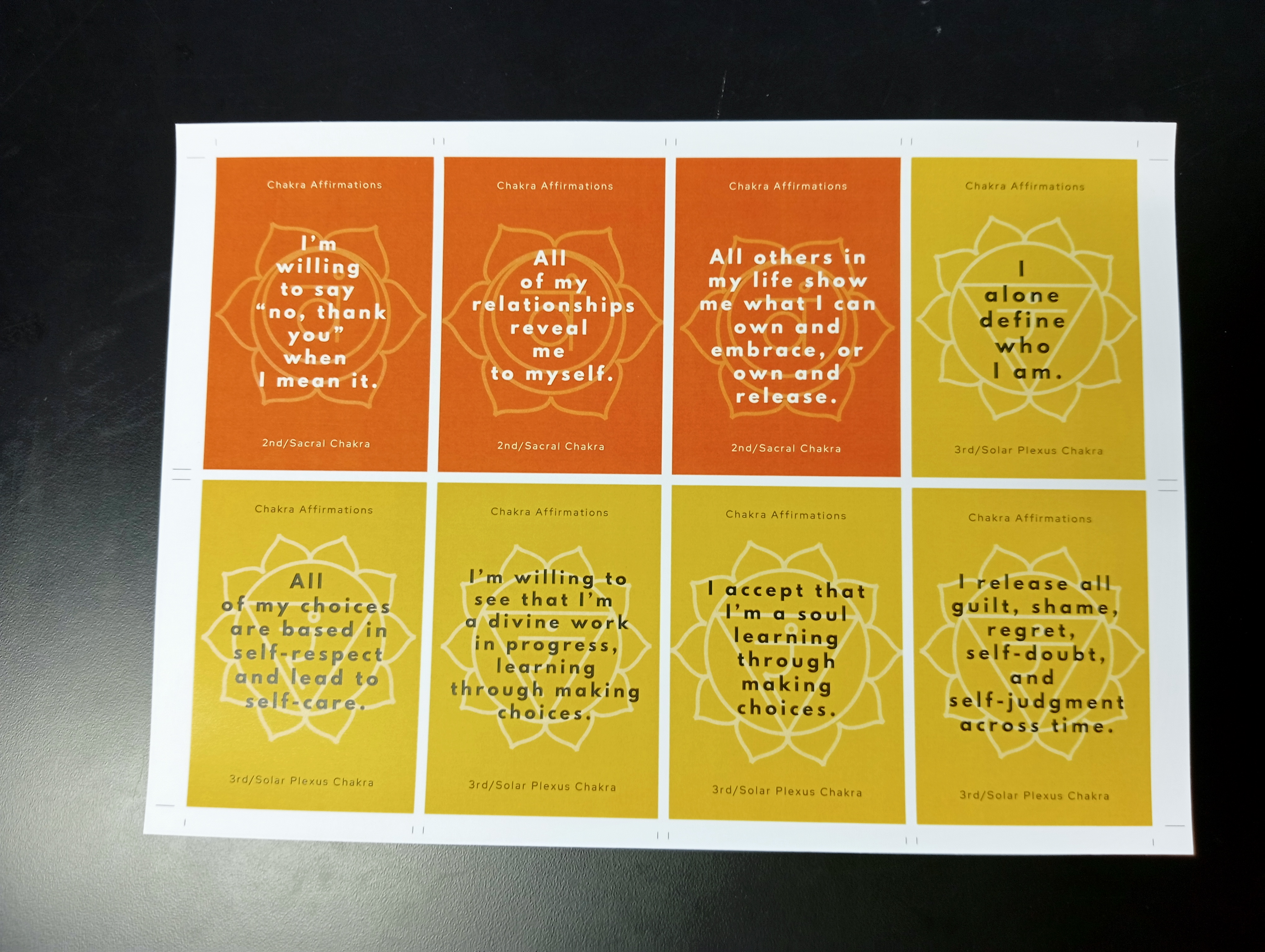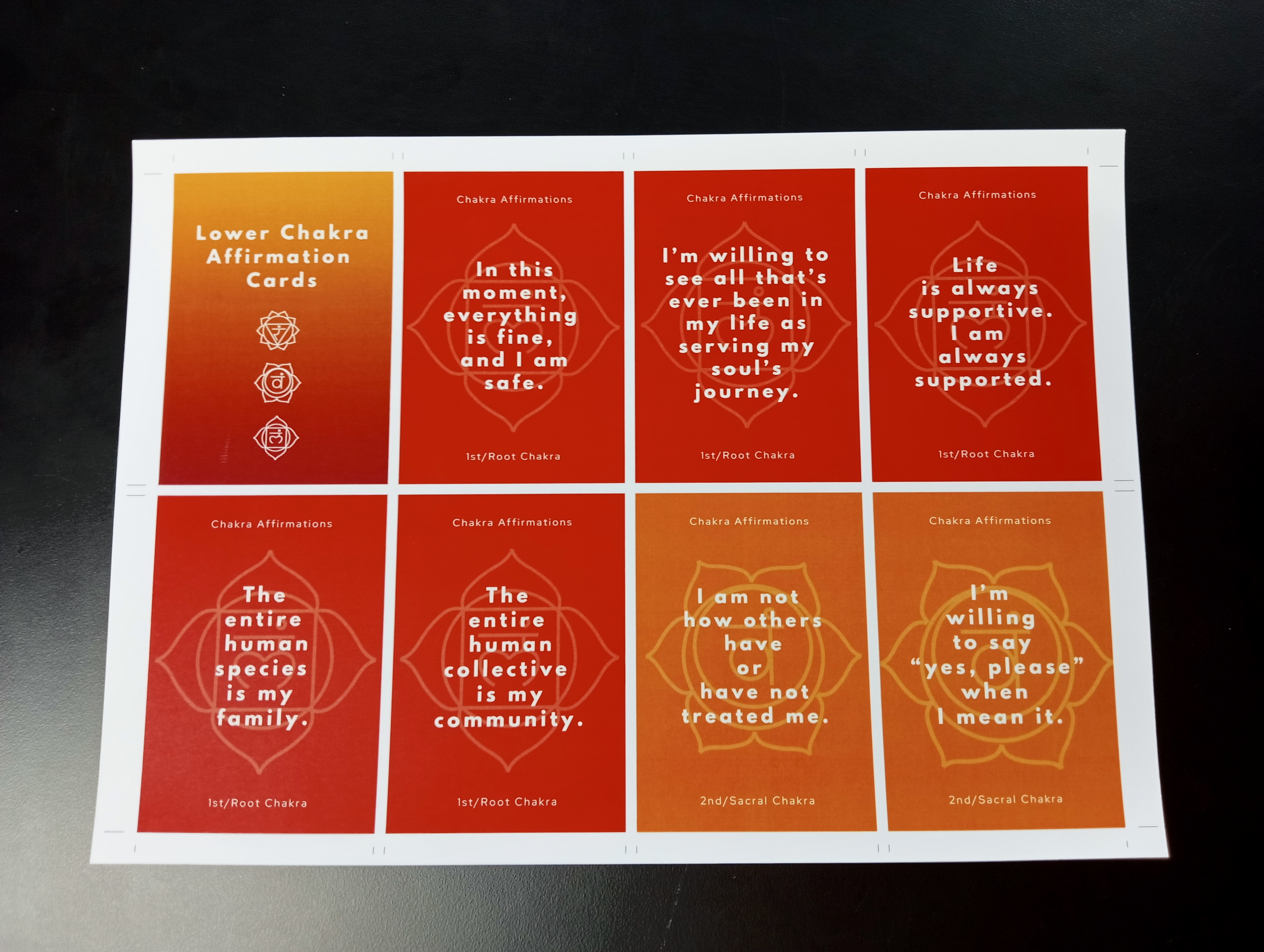 Download the PDF design based on your paper size and and then print and trim your own deck of 16 cards. There are 5 affirmations for each of the 3 lower chakras and one cover card.
