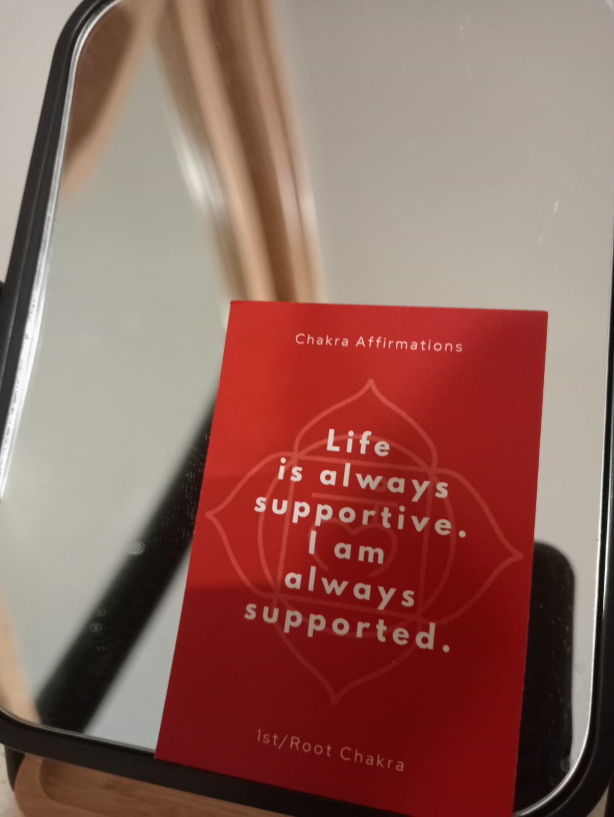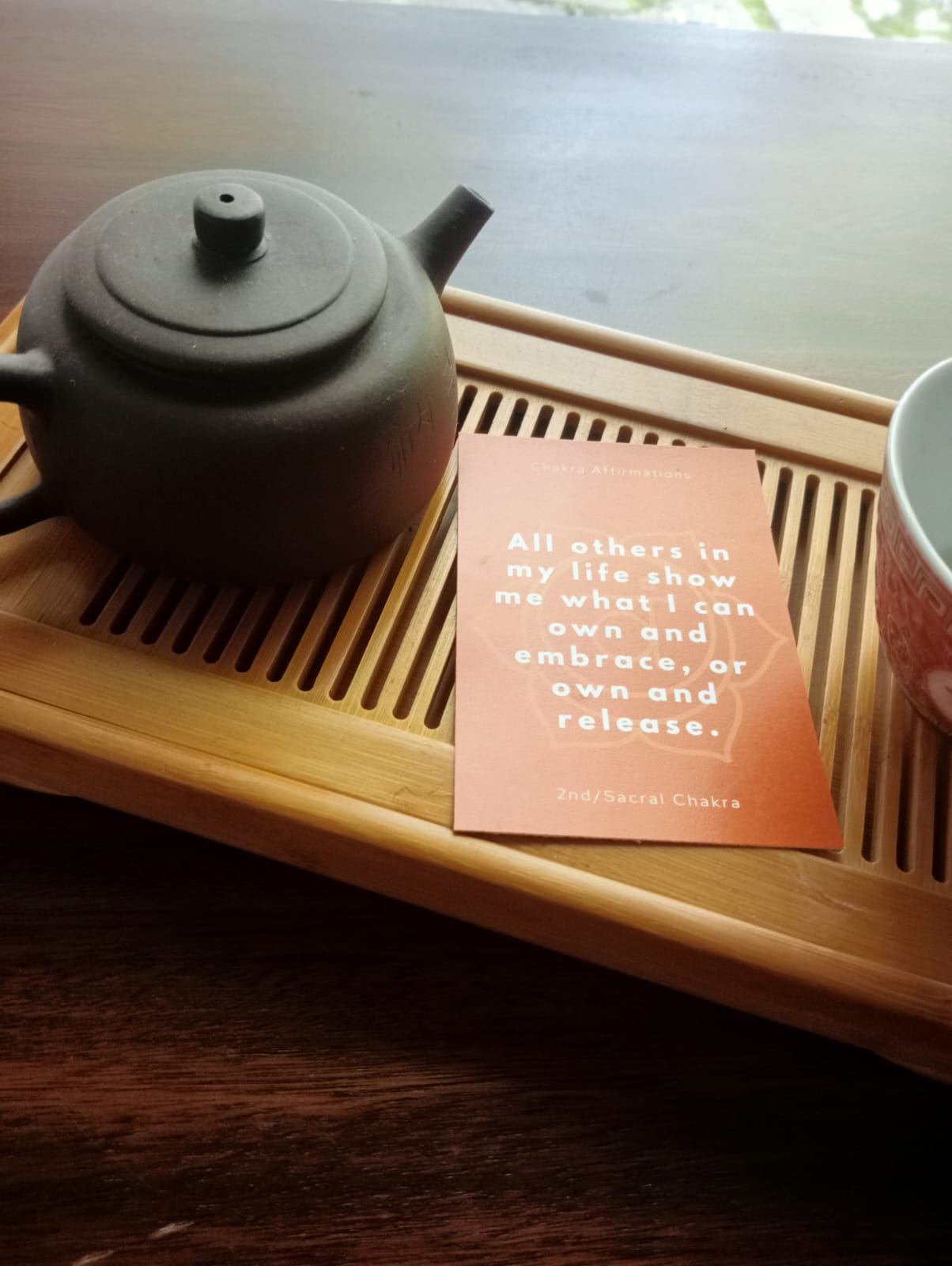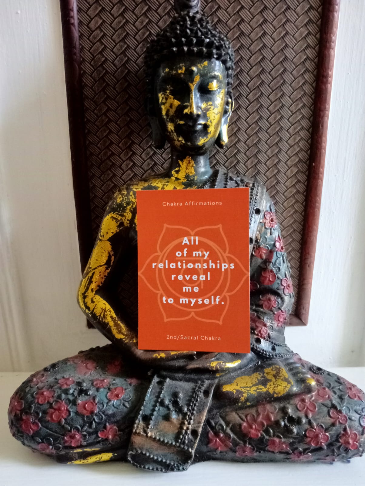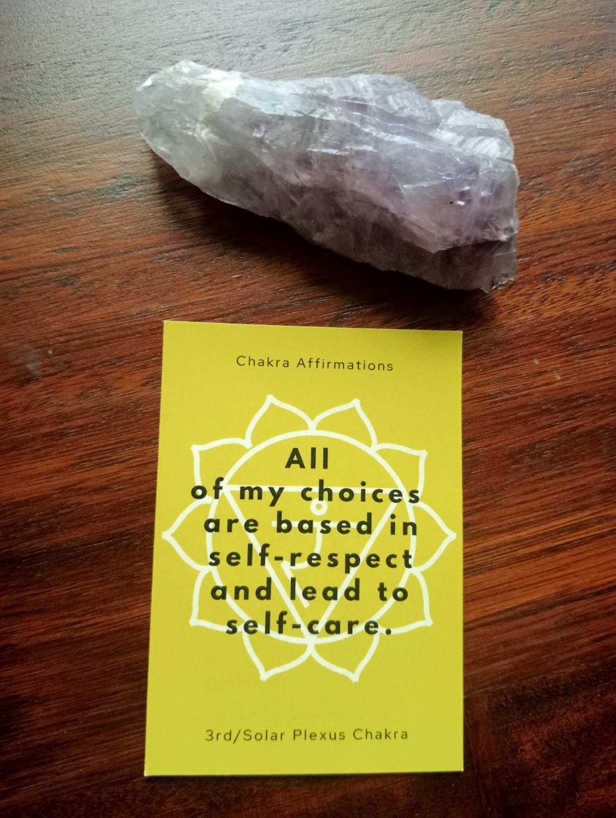 Download the PDF design based on your paper size and and then print and trim your own deck of 16 cards. There are 5 affirmations for each of the 3 lower chakras and one cover card.